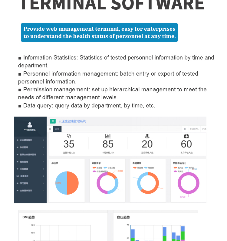 The product is used for health and safety testing of employees before they start work in transportation industries such as aviation pilots and bus drivers, as well as in high-risk fields like construction, coal mining, and electricity, or in companies.